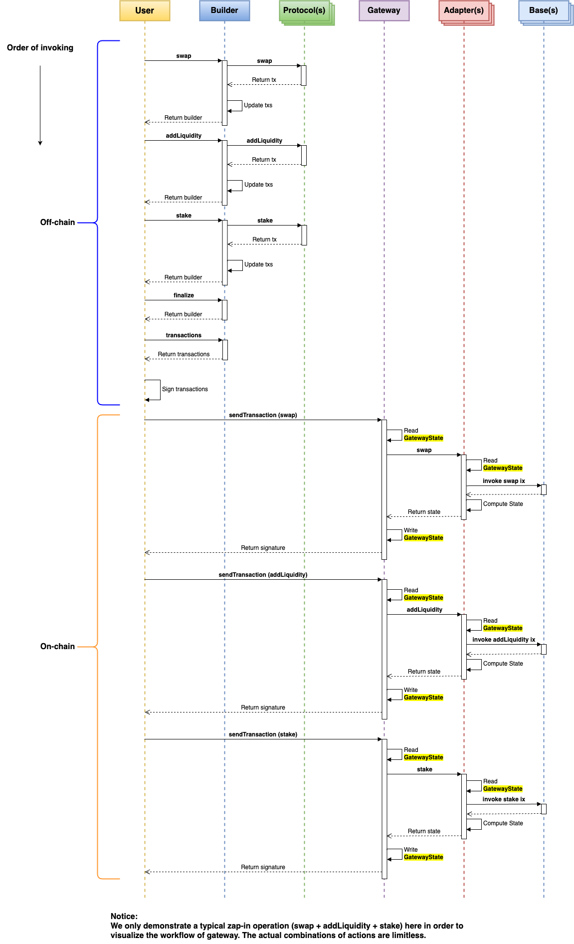 Gateway: On-chain program that receives and dispatches all the transactions, manages state, distributes fees