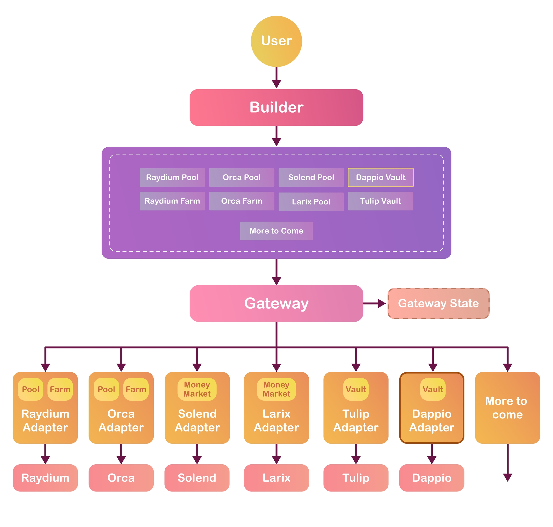 While Builder and Protocols are packaged into a npm module, Gateway (program) and Adapters are Solana programs deployed by Dappio (sometimes third-party) to be invoked to interact with Base programs