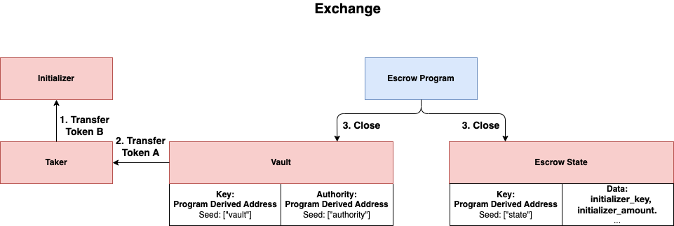 Taker can send a transaction to the escrow to exchange Token B for Token A. First, tokens (Token B) will be transfered from Taker to Initializer. Afterward, the tokens (Token A) kept in the Vault will be transfered to Taker. Finally, both Vault and EscrowState will be closed.