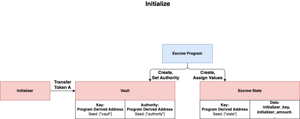 initialize, what happens is that the input accounts are assigned toEscrowAccountfields one by one. Then, a program derived address, or PDA, is derived to be going to become new authority ofinitializer_deposit_token_account.In