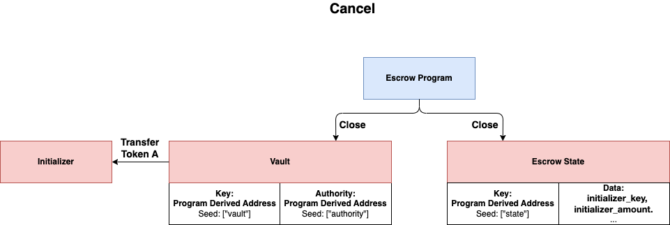 Initializer can also send a transaction to the escrow program to cancel the demand of escrow. The tokens will be transfered back to the Initialzer and both Vault and EscrowState will be closed in this case.