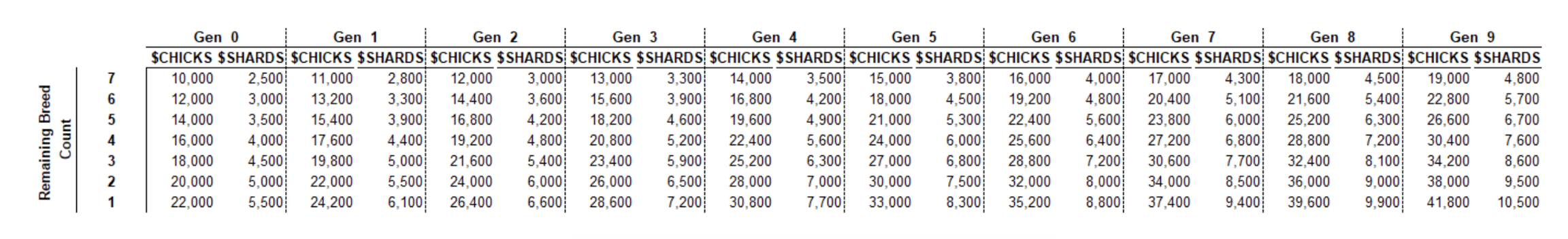 Below is a table showing the required number of $CHICKS and $SHARDS for breeding for each parent NFT for different generations and remaining breed counts.