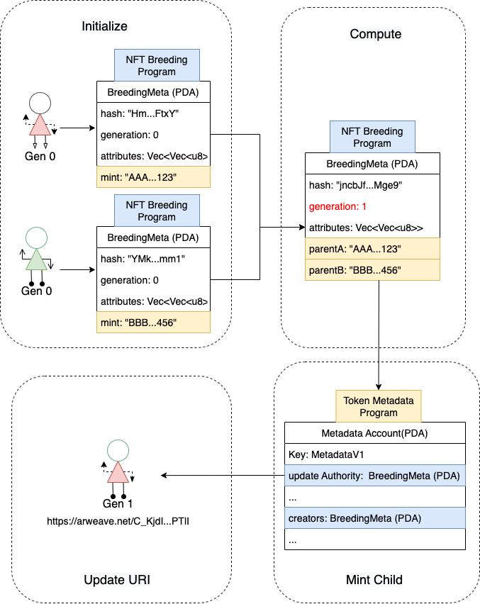 The application for breedable NFT with common mechanisms and its tokenomics. This session will be set as a basic breeding approach with verifiable randomness. Not only use as gamefi application but also extension and flexibility for new standard on metaplex.