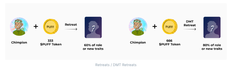 Advanced DMT retreat for 666 $PUFF => features extra trips & chilled parties, therefore the chance of 80% for adopting a role.
