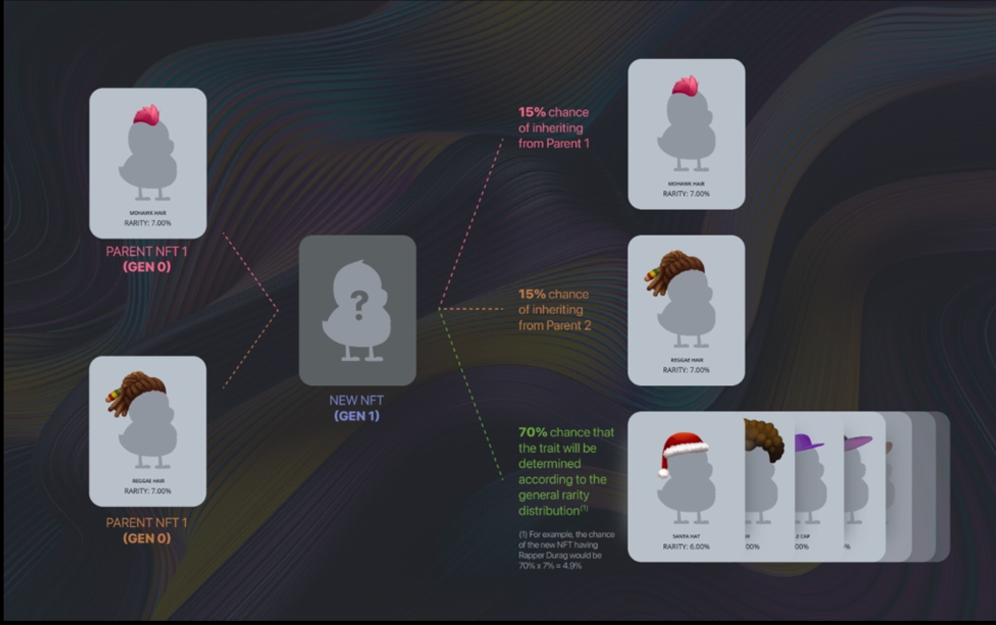 Breeding NFTs is a mechanism in which two breedable NFTs breed to form a new NFT offspring.