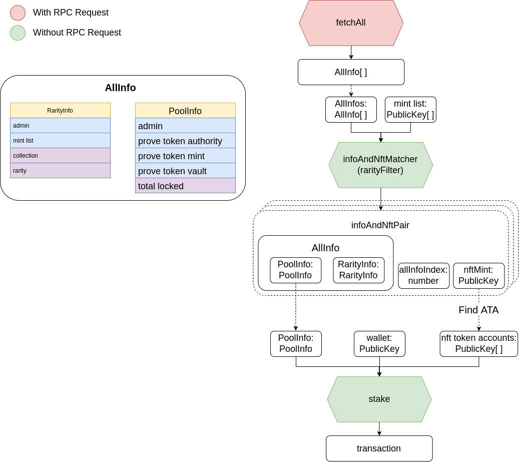 Let's take a closer look at v1 SDK, the root cause of why we need to make multiple RPC request comes from the bad design of the interface. If we only had pool info key associated with PoolInfo, we would force fetching data in every function that requires PoolInfo data except the key. Actually, we can extract the fetching data from building transaction by implementing a fetch function, so called fetchAll(), to get all account we need for no matter matching NFT with pool or building transaction.